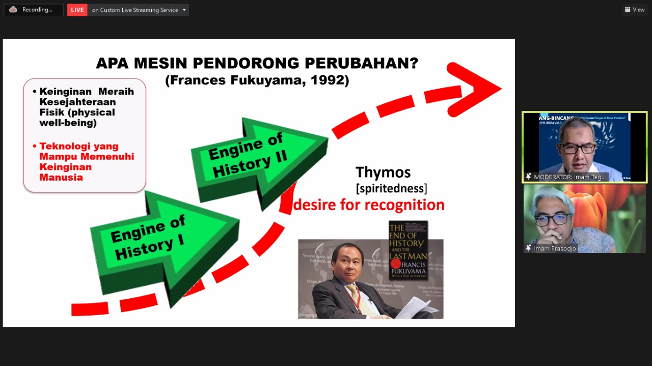 Pembicara lainnya, sosiolog Dr. Imam Prasodjo, menjelaskan adanya dikotomi para developmentalist yang mengagungkan pertumbuhan versus para konservasionis yang mendesak perlunya melestarikan sumber daya alam, mengurangi pemanasan global, dan pemulihan layanan ekosistem. “Yang adil adalah dengan menerapkan pembangunan berkelanjutan (sustainable development),” kata Imam. Ia juga menekankan bahwa paradigma pembangunan tidak semata-mata hanya soal pertumbuhan (growth) melainkan juga soal kebahagiaan (human-eco happiness) atau ecosystem well-being. Dalam hal ini, Imam melihat IPB University seharusnya menjadi tulang punggung dalam konteks eco-happiness.