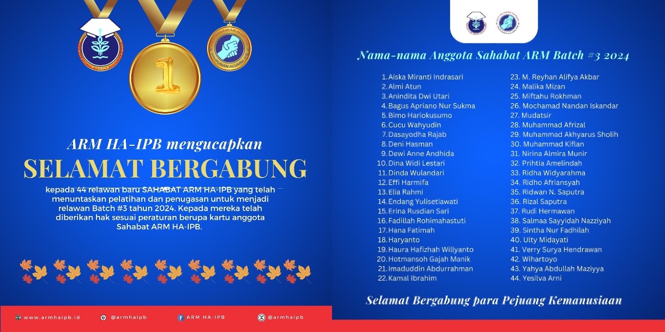 Aksi Relawan Mandiri Himpunan Alumni IPB (ARM HA-IPB) mengucapkan selamat bergabung kepada 44 relawan baru Sahabat ARM yang telah lulus menyelesaikan pelatihan dan penugasan Batch #3 (22 Juni 2024). Semoga dapat berkontribusi dan membantu mereka yang membutuhkan pertolongan di berbagai penjuru negeri.